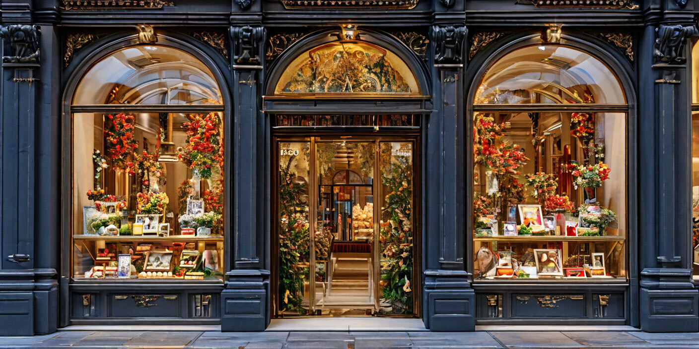 Флористическое оформление: Живые или искусственные цветы добавляют витрине свежести и привлекательности.